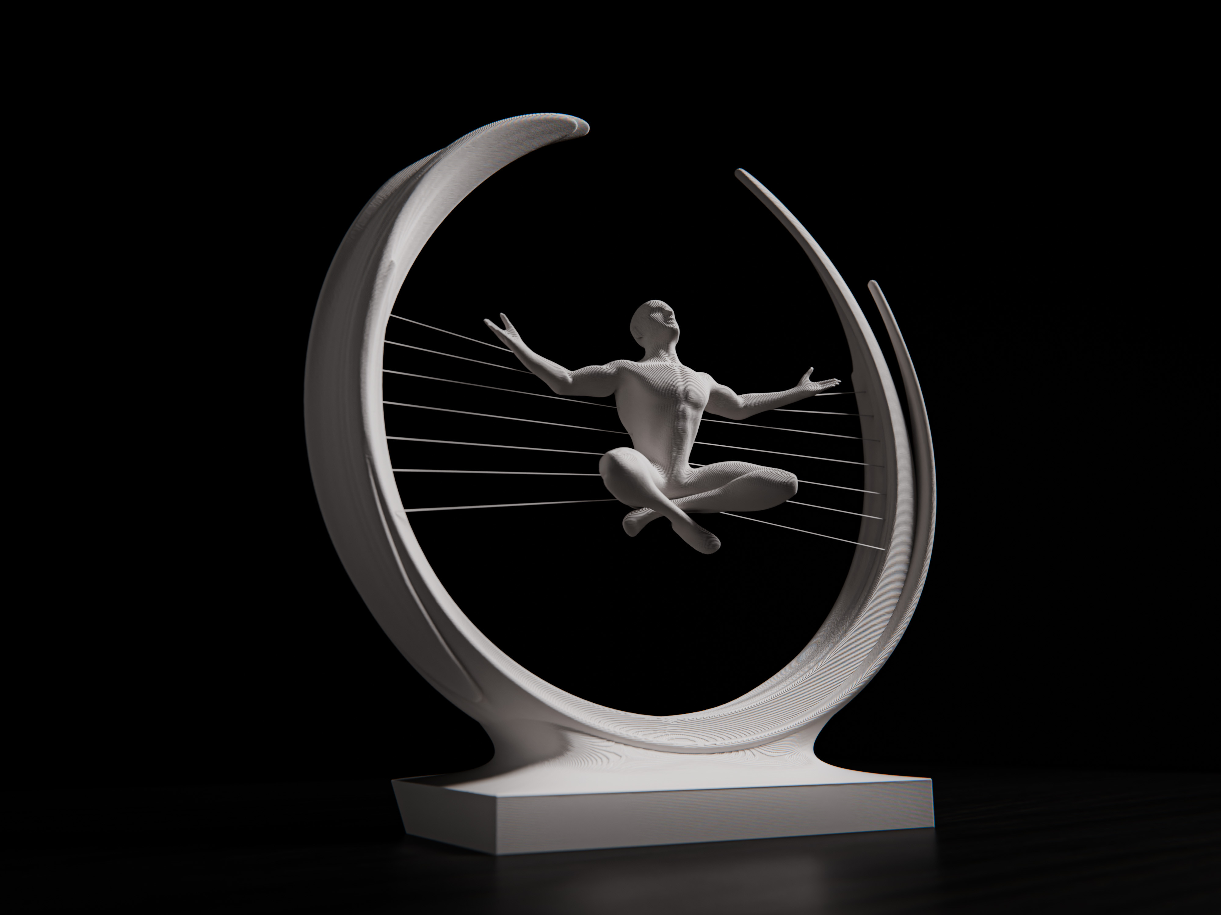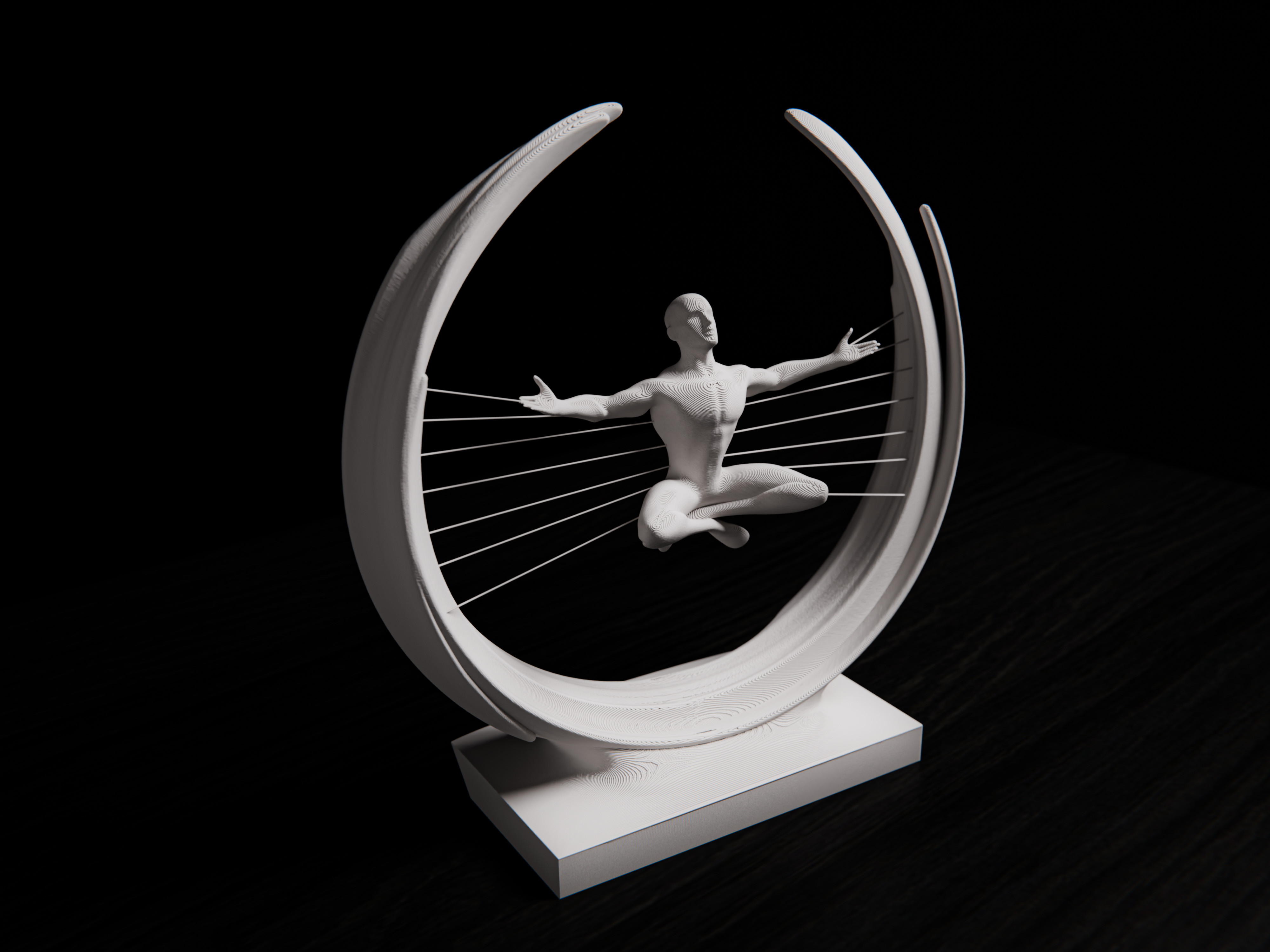 The meditative human figure, suspended within an open circular form, symbolizes harmony between body, mind, and energy.