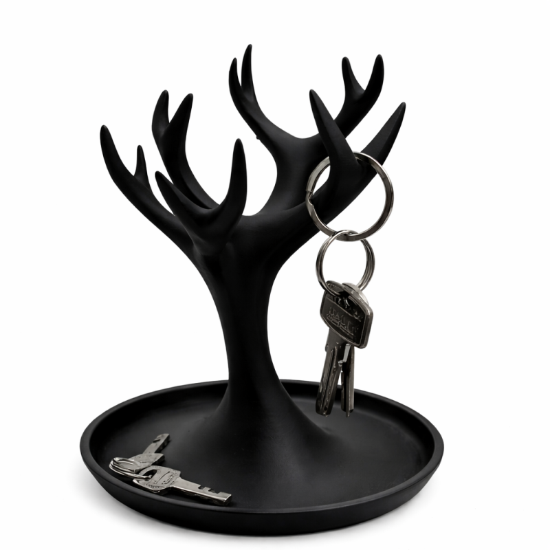 The branches are ideal for hanging keys and jewelry, while the integrated base tray holds coins, rings, or daily essentials.