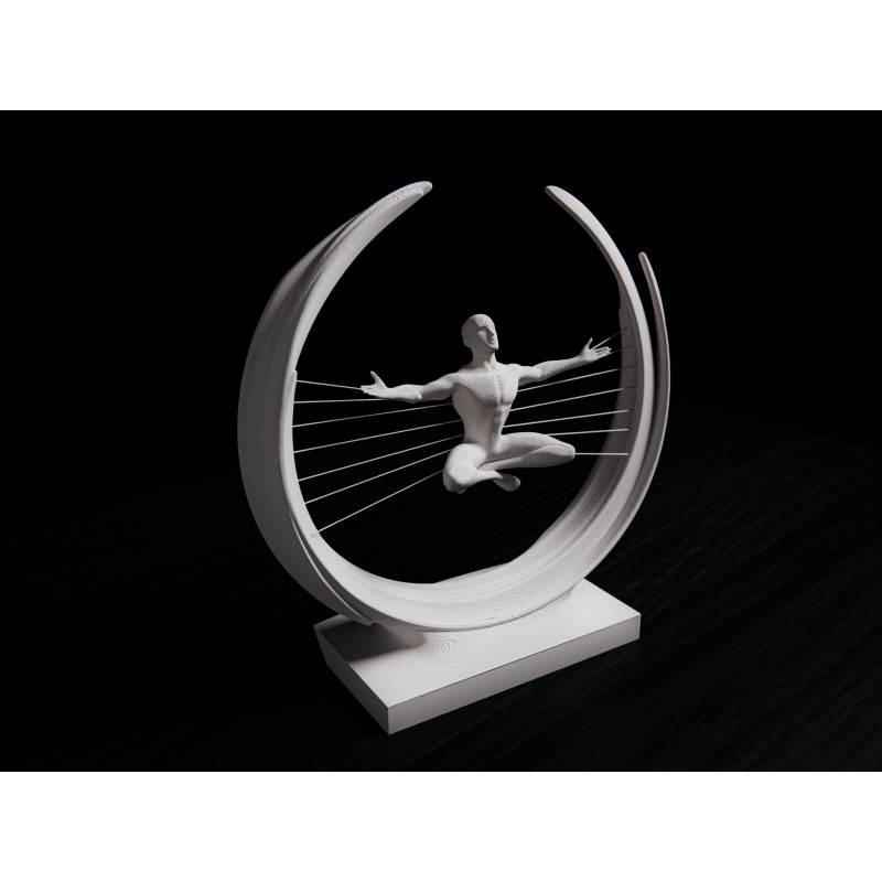 La figure méditative suspendue dans une forme circulaire ouverte évoque l’équilibre entre le corps, l’esprit et l’énergie.