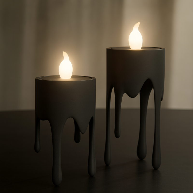 Candela fluttuante in resina lucida, effetto cera sciolta. Stampa 3D di alta qualità per un’atmosfera sofisticata, elegante e sicura in ogni ambiente.